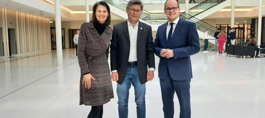 Am Dienstag konnte Stationsleiter Dr. Florian Brandes bei einem Gespräch im Niedersächsischen Landtag der Landwirtschaftsministerin Miriam Staudte und Wirtschaftsminister Grant Hendrik Tonne die Pläne zum Ausbau der Wildtier- und Artenschutzstation vorstellen. Geplant ist einen Gebäudeteil aufzustocken, um mehr Platz für Reptilien und die tiermedizinische Versorgung unserer Pfleglinge zu schaffen und auch die Arbeitsbedingungen für die Mitarbeitenden zu verbessern. Mit dem Ausbau verbunden wird auch eine energetische Sanierung des Gebäudes. Sowohl Ministerin Staudte als auch Minister Tonne zeigten großes Interesse an unseren Plänen und sagten ihre Unterstützung bei der Suche nach entsprechenden Fördermitteln zur Finanzierung der Baumaßnahmen zu.